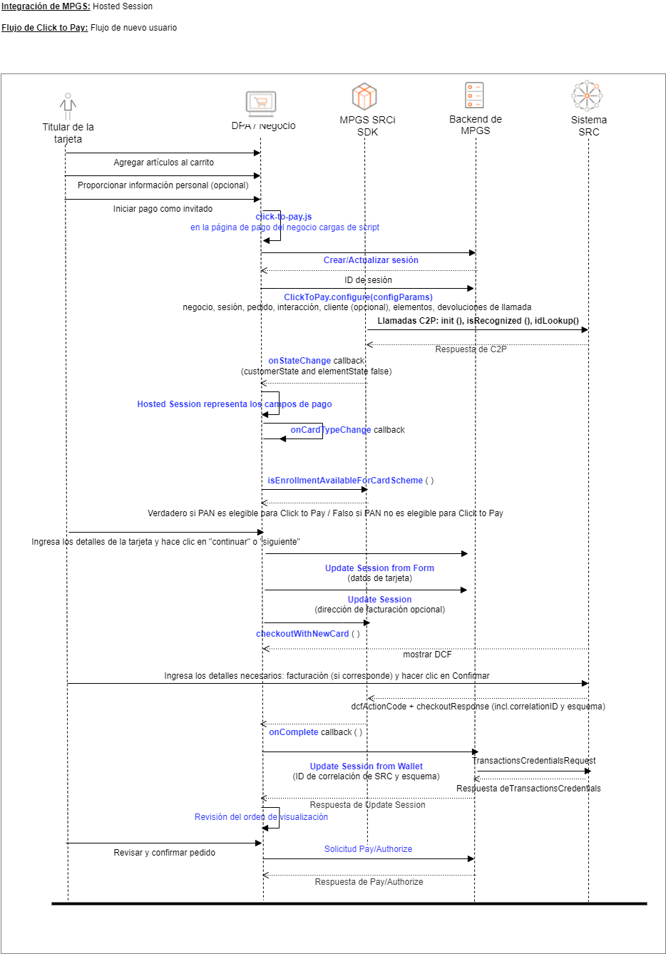 Las siguientes figuras ilustran los flujos relacionados con los tres escenarios. Para obtener más información sobre cómo implementarlos, consulte Integración de Hosted Session de Click to Pay.